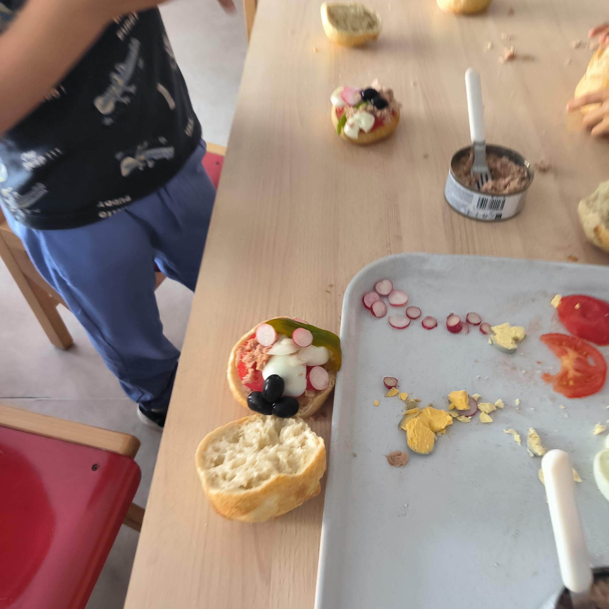 Dans le cadre de la semaine du goût et en lien avec le projet de classe qui est "culture et patrimoine niçois" les élèves de CP ont travaillé autour du Pan Bagnat. Ils ont d'abord étudié la recette écrite par les CE1 puis sont allés au marché du ray, liste de courses en main, pour acheter les ingrédients nécessaires à la confection du vrai Pan Bagnat niçois.