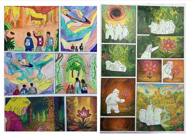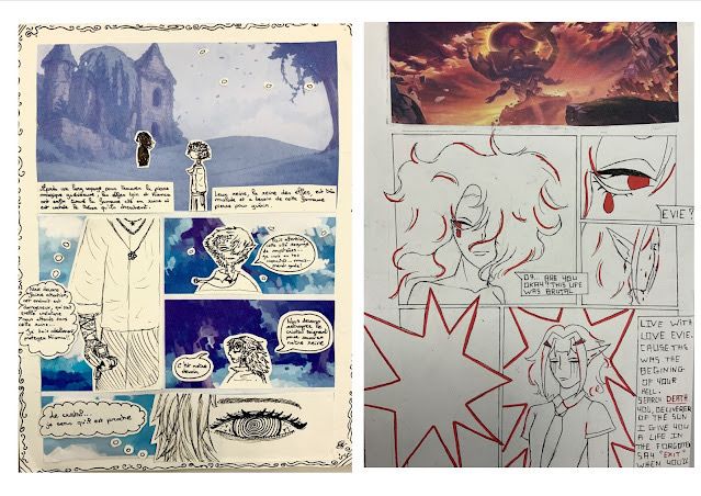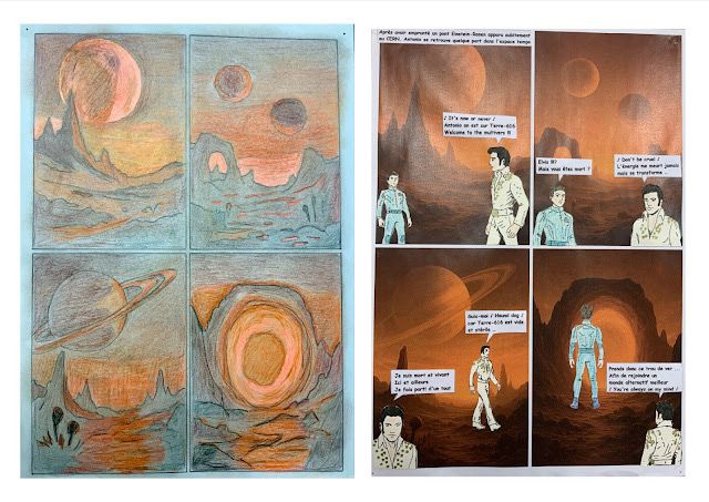 A l'aide d'une IA, sous la forme d'une unique planche de BD, les élèves de 3ème ont pu raconter en images cette quête dans ce lieu dévasté et désert afin de poursuivre l'histoire à leur guise. Une case au moins a été réalisée avec l' IA COPILOT à partir de la réalisation d'un PROMPT. Les personnages, les bulles et certaines cases ont été dessinées, découpées et collées sur la bd imprimée.